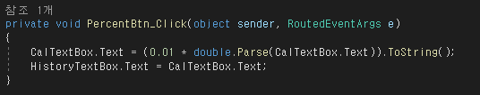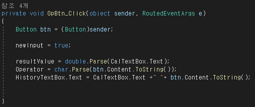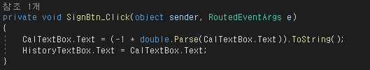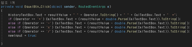 처음엔 숫자들의 Click 이벤트 함수 이름을 각각 ZeroBtn_Click, OneBtn_Click, ... NineBtn_Click 이런식으로 부여할까 하다가 코드가 너무 복잡해질거 같아 NumberBtn_Click으로 통일 시켰다.