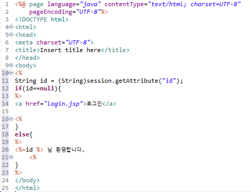 하지만 JSP에서는 세션 객체를 자동으로 생성해주기 때문에 생성하는 코드 없이 위 menu.jsp 처럼 session객체를 바로 사용 가능하다.