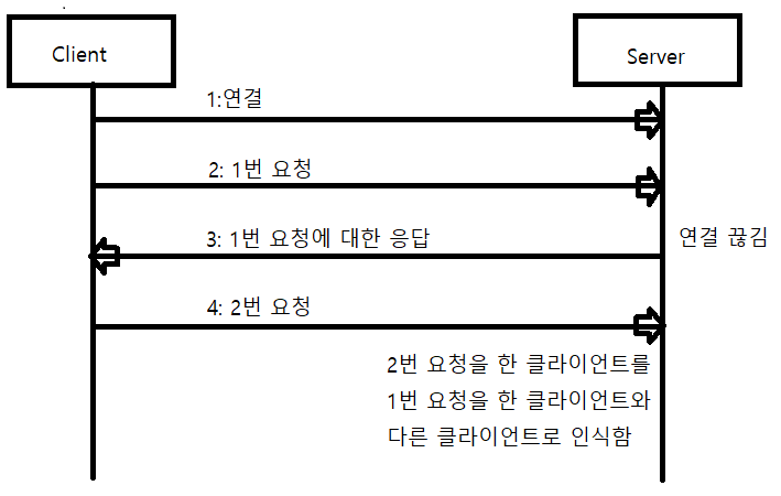 즉, 클라이언트가 한 번 요청을 하고 서버에서 응답을 하면 해당 클라이언트와 서버와의 연결은 유지되지 않는다는 특징이 있다. 쉽게 설명하면 클라이언트가 첫 번째 요청을 보내고 서버가 이에 대한 답을 하고 똑같은 클라이언트가 두 번째 요청을 했을 때 서버에서는 두 번째 요청을 한 클라이언트가 첫 번째 요청을 한 클라이언트임을 인식하지 못한다.