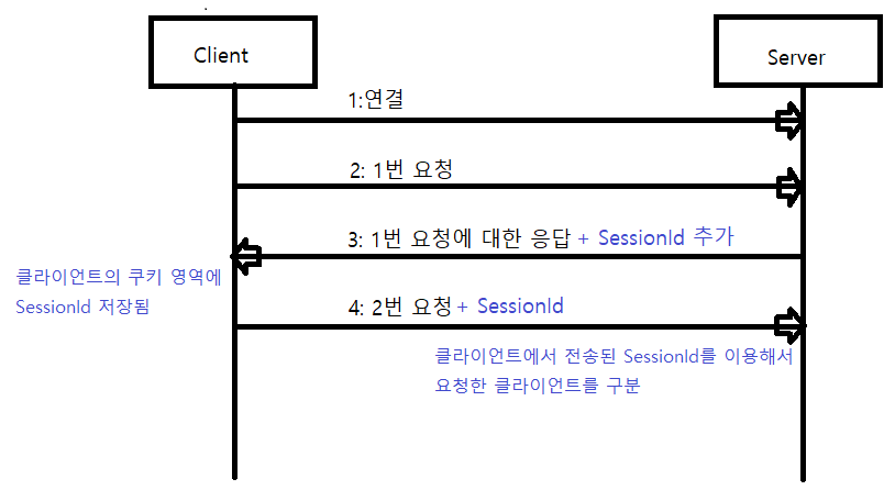세션 기능을 이용하면 클라이언트의 요청에 대한 응답을 할 때 서버에서는 중복되지 않는 세션 아이디를 클라이언트마다 부여해서 응답에 같이 보낸다. 그리고 이 세션 아이디는 클라이언트의 쿠키 저장소에 저장되게 되고 클라이언트가 다시 요청하면 이 세션 아이디가 요청에 같이 전송 된다. 서버는 요청에 전송되어오는 세션 아이디를 판별하여 두 번째 요청을 한 클라이언트가 첫 번재 요청을 한 클라이언트임을 확인할 수 있다.