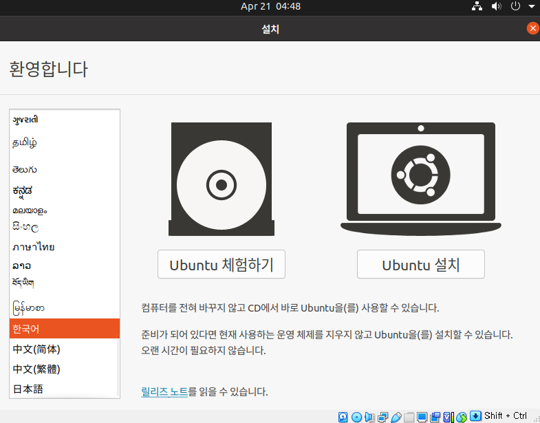 언어 선택 후 [ubuntu 설치] 클릭