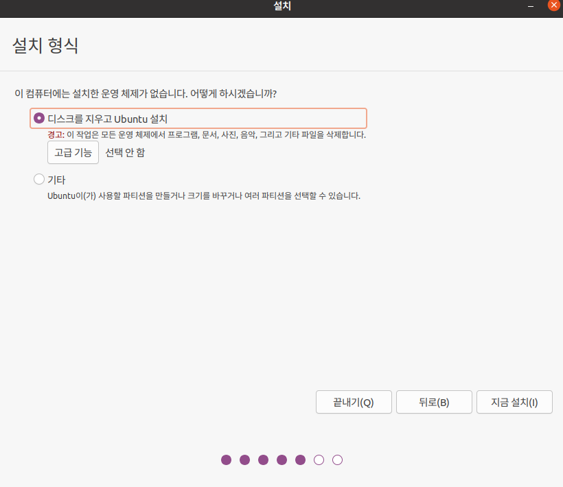 아무것도 설치되어 있지 않은 가상 디스크이기 때문에 다음과 같이 선택 후 [지금 설치]를 클릭해준다.