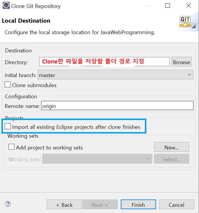 Clone이 끝난 후 모든 파일을 Import하고 싶으면 위에 파란박스를 체크하면 됩니다.