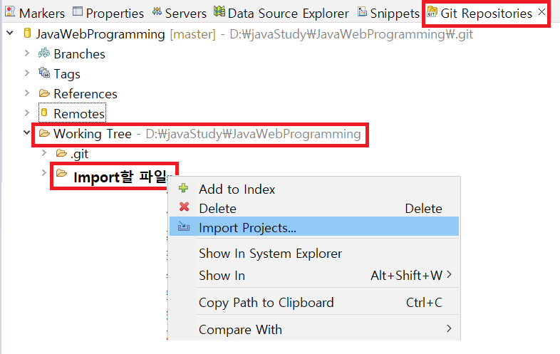 [Git Repositories] 뷰에서 Import할 파일을 선택하여 [Import Projects...] 메뉴를 클릭한다.