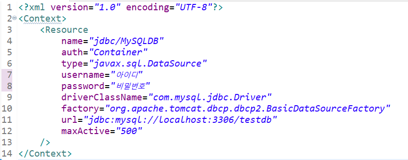 WebContent \ META-INF 밑에 context.xml 파일을 생성하여 리소스를 정의한다.