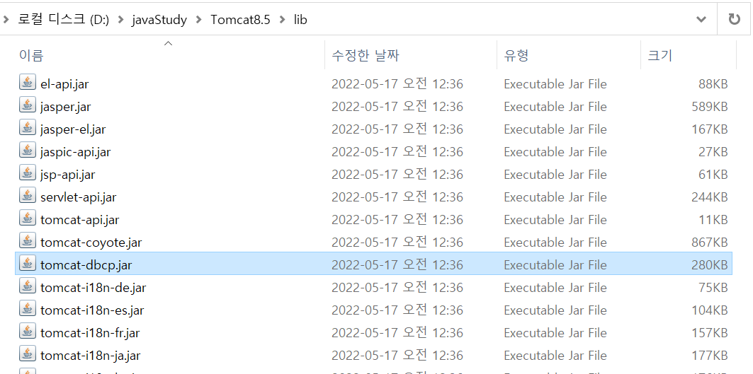 ※톰캣에는 톰캣 설치 경로/lib 디렉토리에 CP(Connection Pool) 기능을 제공하기 위해 DBCP API를 제공한다.