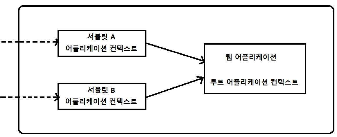 서블릿 A와 B는 각각 자신의 전용 어플리케이션 컨텍스트를 갖고 있습니다. 동시에 두 컨텍스트가 공유해서 사용하는 빈을 담아놓을 수 있는 별도의 컨텍스트가 존재합니다. 이 컨텍스트는 각 서블릿에 존재하는 컨텍스트의 부모 컨텍스트이며, 최상단에 위치하므로 계층구조에서 볼 때 루트 컨텍스트입니다.
