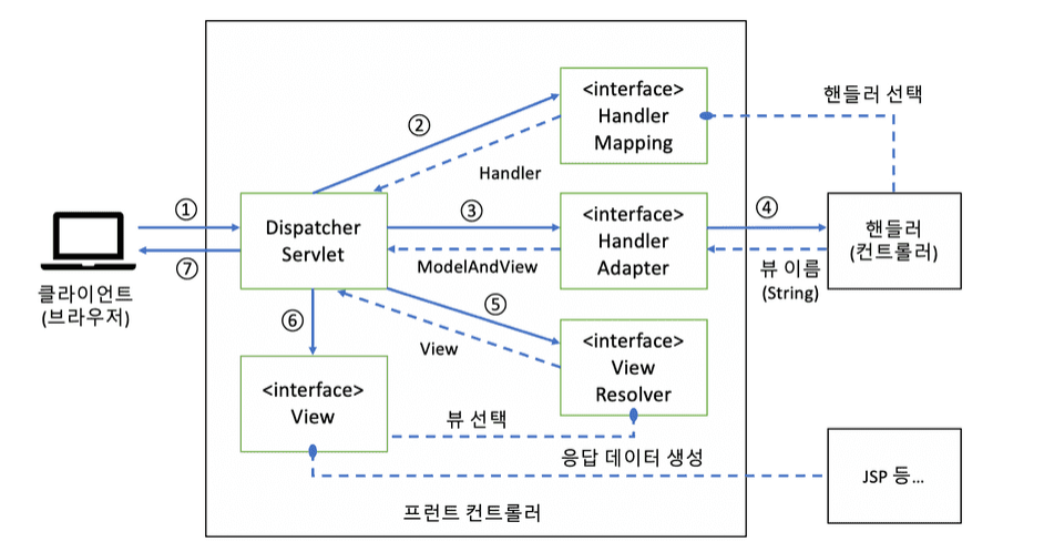 - `DispatcherServlet` 클래스는 `Handler(Controller) `에 대응되는 `HandlerAdapter`를 찾고 `HandlerAdapter` 인터페이스의 `handle` 메소드를 호출해서 `Handler(Controller)` 객체의 메소드 호출을 의뢰합니다.