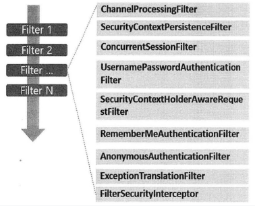 Spring Security 내부에 여러 개의 필터가 각자 특정 책임을 갖고 Request와 Response에 대한 보안 처리를 담당합니다. Spring Security는 `필터 체인(Filter Chain)`이라는 구조를 갖습니다. Filter는 확장 설정하여 다양한 처리가 가능하며 Filter 사이에 종속성이 있어 순서가 중요합니다.