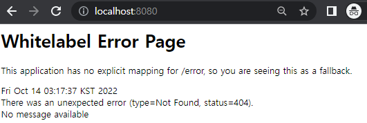 - 아직 어떠한 컨트롤러도 생성하지 않았기에 정상적인 화면 출력이 되지 않는다.