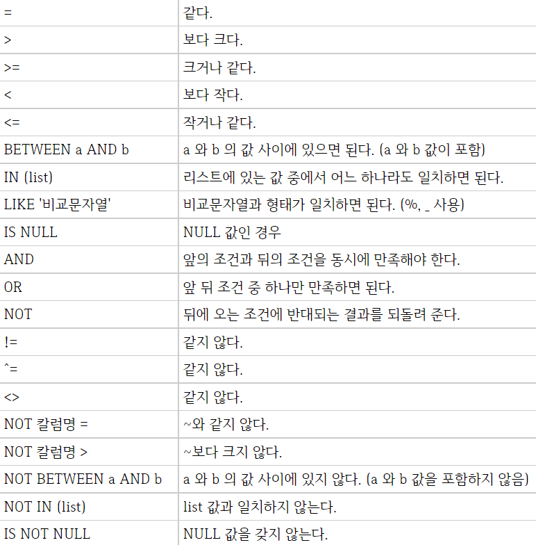 SELECT   열이름   FROM   테이블명   WHERE   (열이름1   산술연산자   열이름2)   비교연산자   비교할대상;