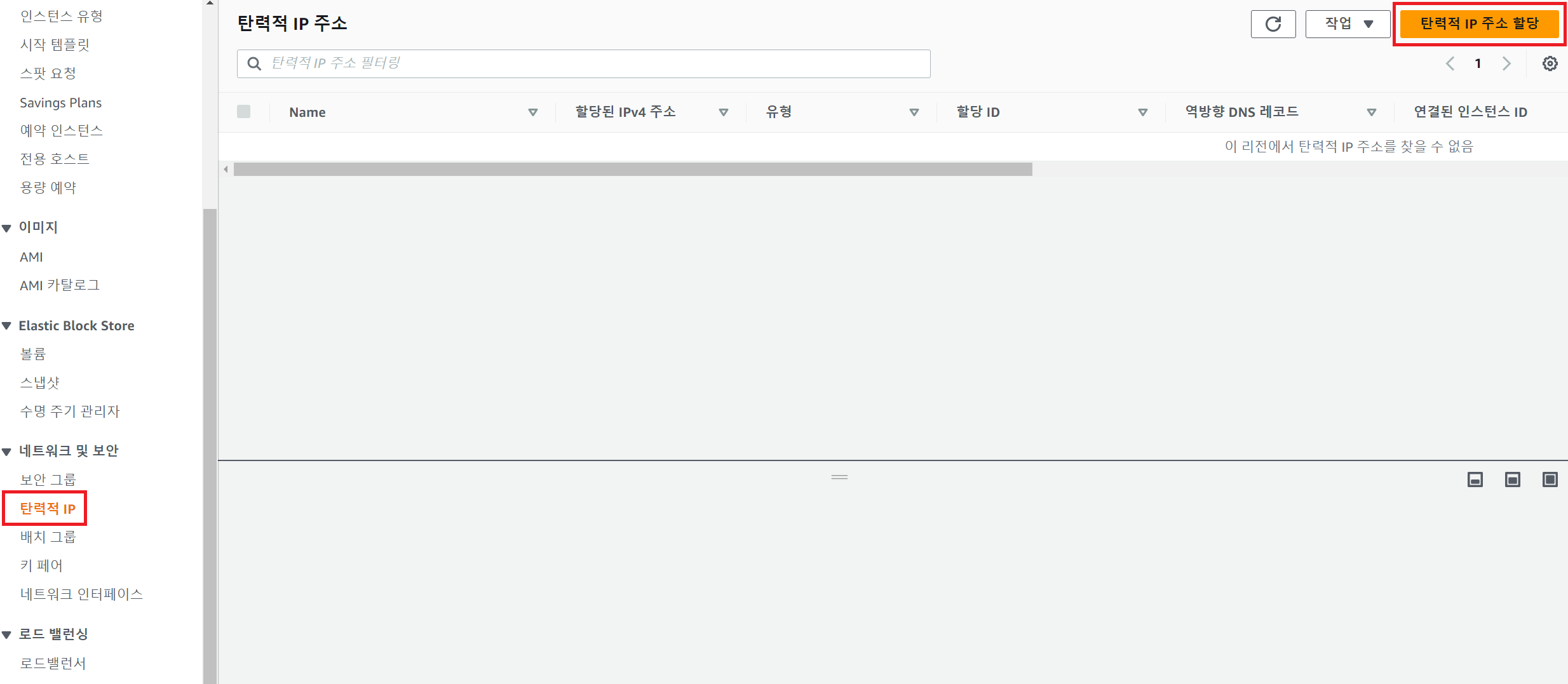 왼쪽 메뉴에서 [탄력적 IP]를 클릭한 후 주소를 할당해줍니다.