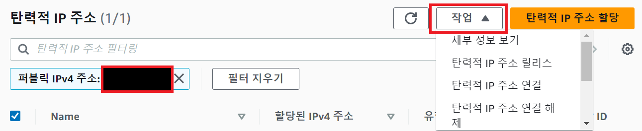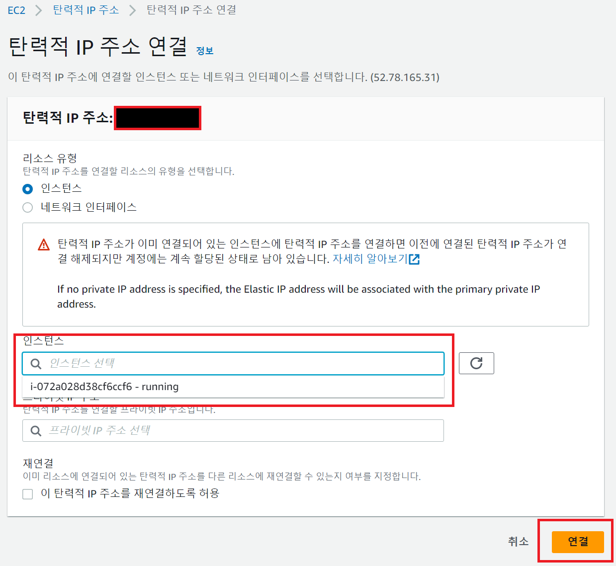 할당받은 탄력적 IP 주소를 연결해줍니다.