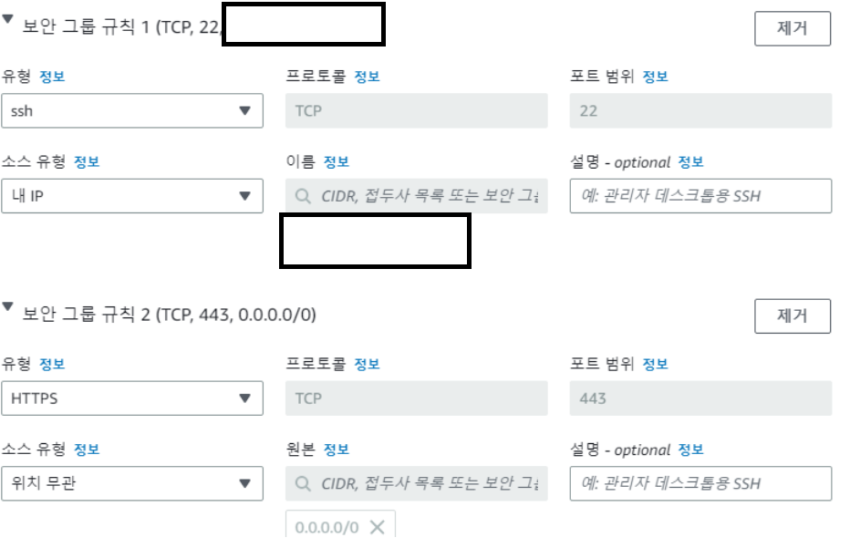 일단 기본적으로 SSH / HTTPS / HTTP를 설정해주었고 추후에 보안 그룹 규칙을 추가해야할 경우 따로 설정하도록 하겠습니다.