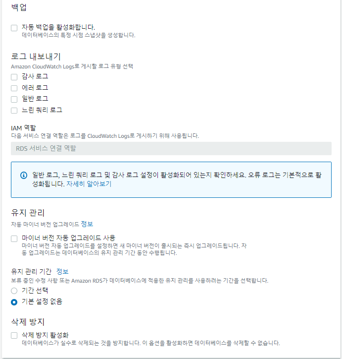 단순히 실습이기도 하고 혹시 백업 기능을 활성화 하였을 때 과금이 될 수 있을까 하여 최대한 기능을 사용하지 않았습니다.
