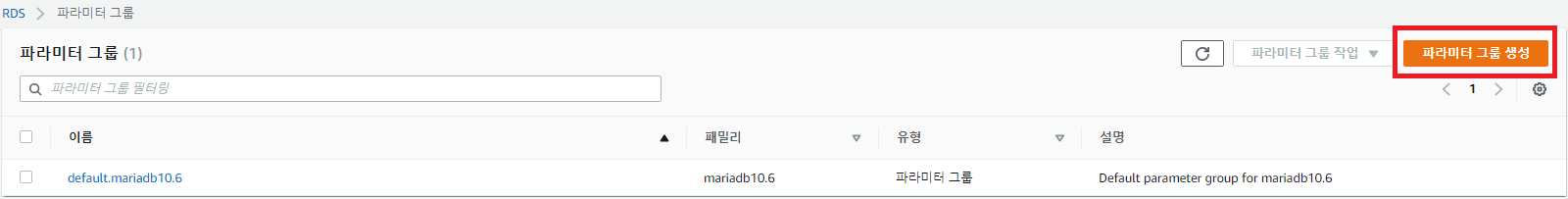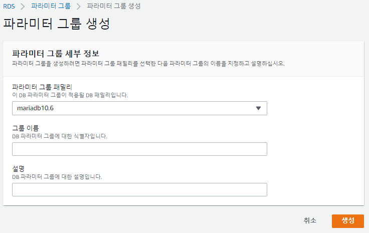 파라미터 그룹 패밀리에 RDS를 생성할 때 선택한 DB 엔진으로 선택해주어야 합니다.