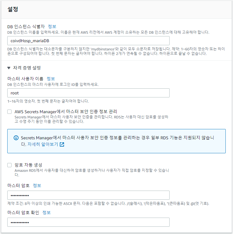 테스트를 해보기 위해 어디서든 접근 가능하도록 [퍼블릭 액세스]를 예로 설정하였습니다. 실제 서비스를 하는 경우 지정 인스턴스 및 다른 리소스만 DB에 연결할 수 있도록 아니요를 선택해주어야 합니다.