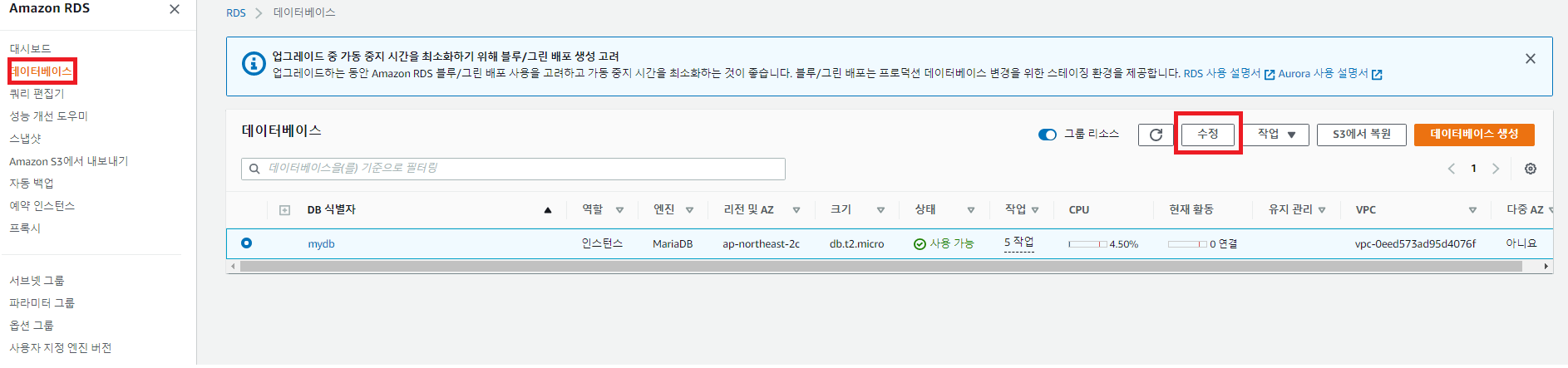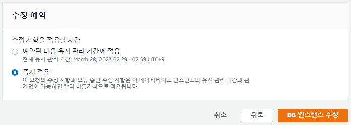 수정해주고, 바로 즉시 적용하기 위해 선택해준 후 [DB 인스턴스 수정] 해줍니다.