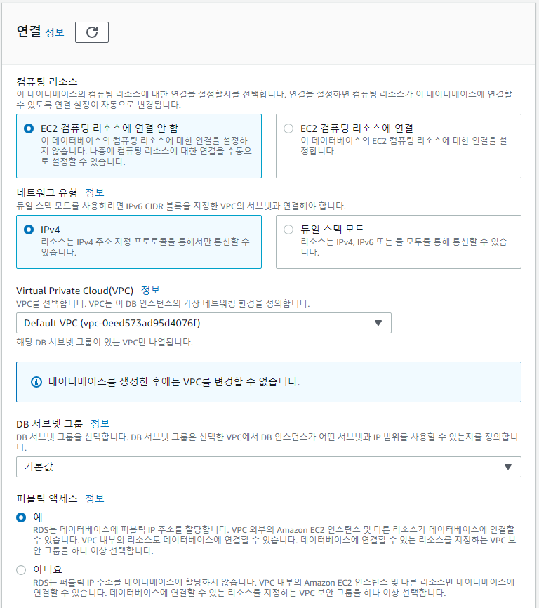 RDS 실습을 위해 생성하는 것이므로 저는 [EC2 컴퓨팅 리소스에 연결 안 함]으로 진행하도록 하겠습니다.