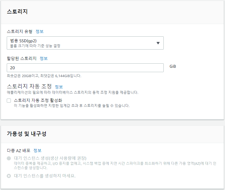 스토리지 자동 조정 활성화할 경우 과금이 발생할 수 있으므로 실습을 위한 프리티어인 경우 해제해 줍니다.