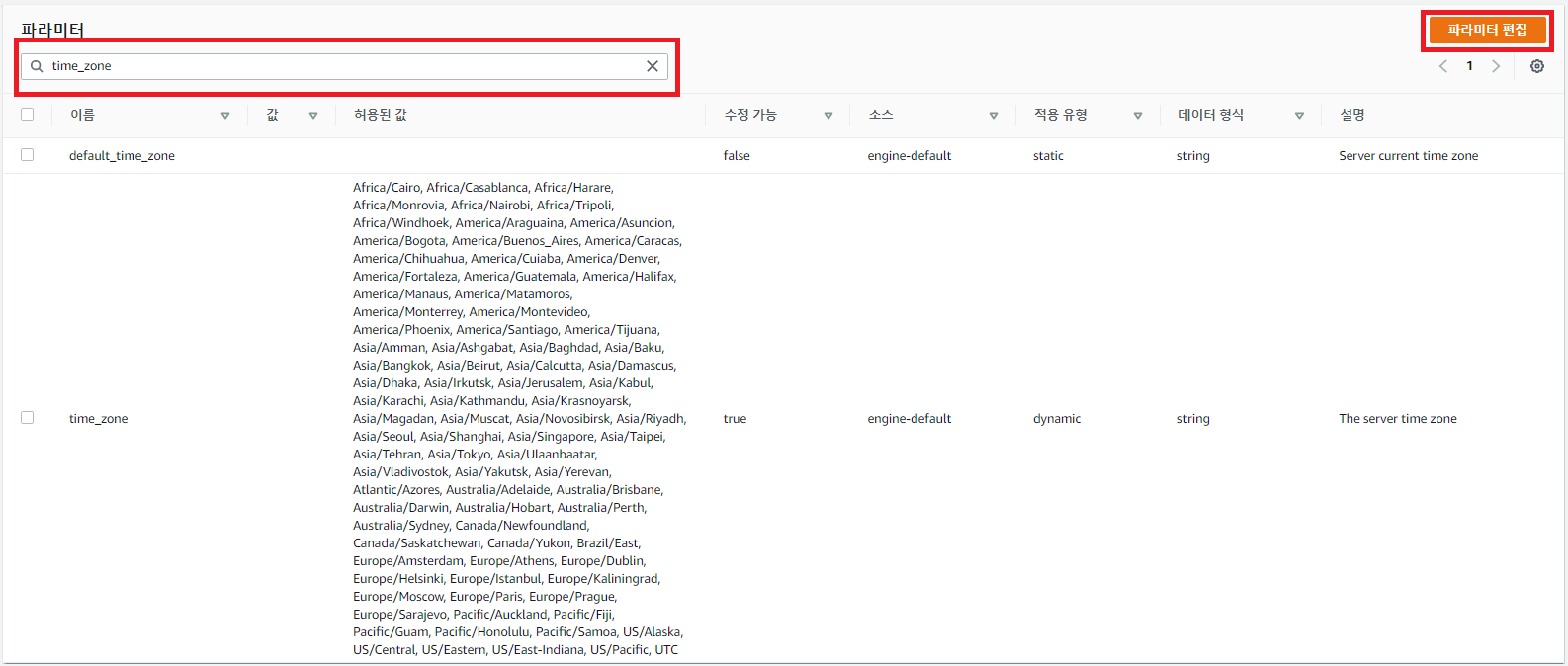 생성한 파라미터 그룹을 클릭하여 들어간 뒤, 오른쪽 상단 [파라미터 편집] 클릭하여 수정한 후 [변경 사항 저장] 해준다.