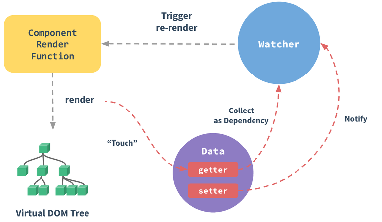 - Vue.js 내부적으로 옵저버 디자인 패턴을 구현하여 의존성을 수집하고 데이터가 변경될 때 와처(watcher)에 알립니다. Vue 인스턴스가 생성될 때, 데이터 객체를 감시하기 때문에 변경이 발생한 경우 Vue.js는 자동으로 UI를 업데이트 합니다.