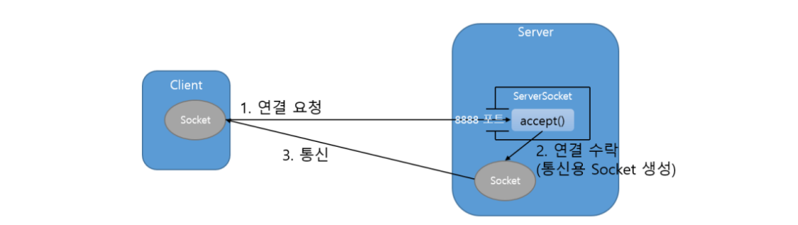 - 클라이언트에서 Socket을 생성하여 연결을 요청하고, 서버에 있는 ServerSocket에서 요청을 수락하면(accept()) 서버는 통신용 Socket을 생성합니다.