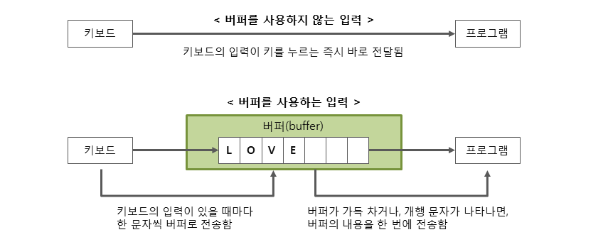 입출력 성능을 향상시키기 위한 방법으로 `메모리 버퍼`를 사용합니다. 기존 방법은 프로그램이 입출력 시 디스크와 직접 데이터를 처리하였었습니다. 하지 중간에 `메모리 버퍼`를 두어 처리함으로, 프로그램은 메모리 버퍼에 데이터를 보내어 쓰기 속도가 향상되고, 버퍼는 데이터를 쌓아서 한꺼번에 디스크에 데이터를보내어 출력 횟수를 줄여 성능을 높였습니다.