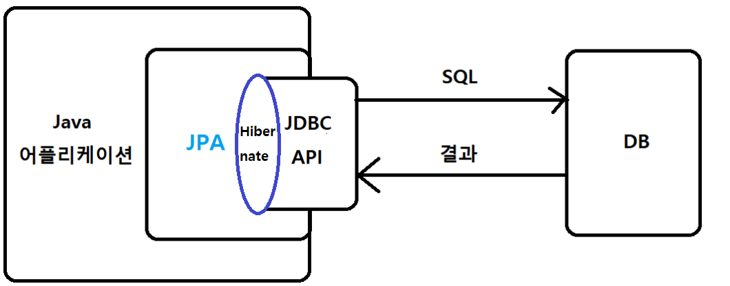 자바 클래스와 데이터베이스 테이블 간의 매핑을 자동화하여 개발자가 SQL 쿼리를 직접 작성하지 않아도 됩니다. 그럼 어떤 구조, 원리로 JPA를 이용하여 데이터베이스에 접근할지 의문이 생길겁니다. JPA는 위 이미지와같이 어플리케이션과 JDBC 사이에서 동작합니다. 개발자가 직접 JDBC API를 사용하지 않고 개발자가 JPA를 사용하면, JPA 내부에서 JDBC API를 사용하여 SQL을호출하고 DB와 통신 합니다.