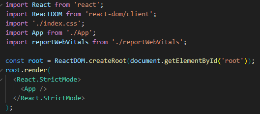 index.js: 자바스크립트 시작점으로, ReactDOM을 사용하여 React 컴포넌트를 실제 DOM에 렌더링 해줍니다.