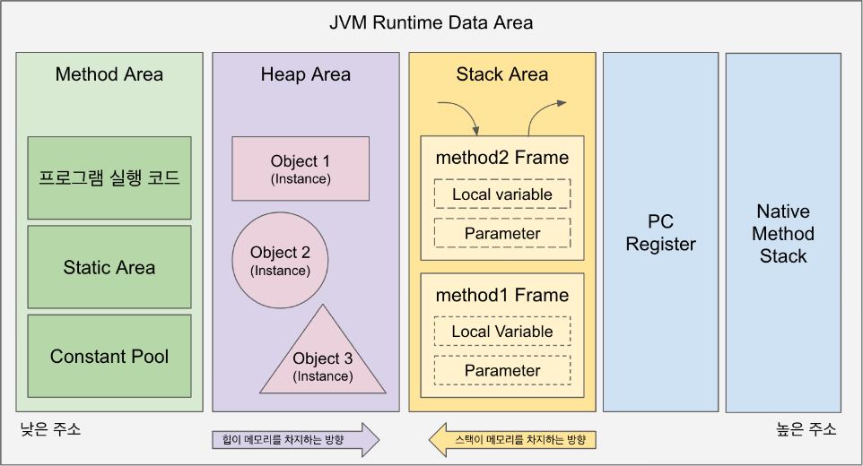 - 메모리 할당: 객체를 생성하면, JVM은 힙 영역에서 메모리를 할당하고 해당 객체의 주소를 반환합니다.